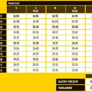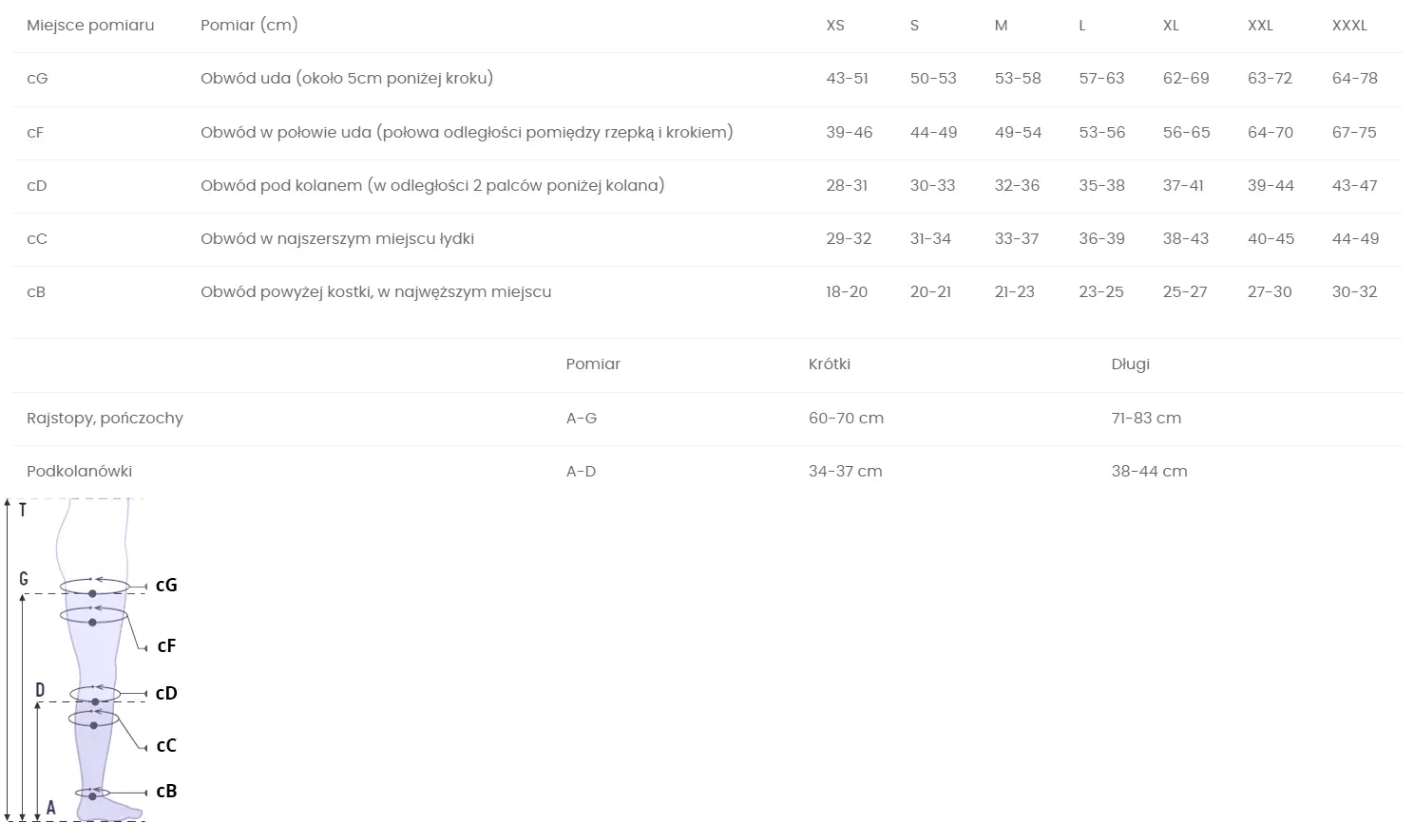 Dobór rozmiaru: W celu właściwego doboru rozmiaru, należy zmierzyć obwody nóg (lewej i prawej) w miejscach wskazanych w tabeli. Pomiaru należy dokonać rano, po nocnym odpoczynku.