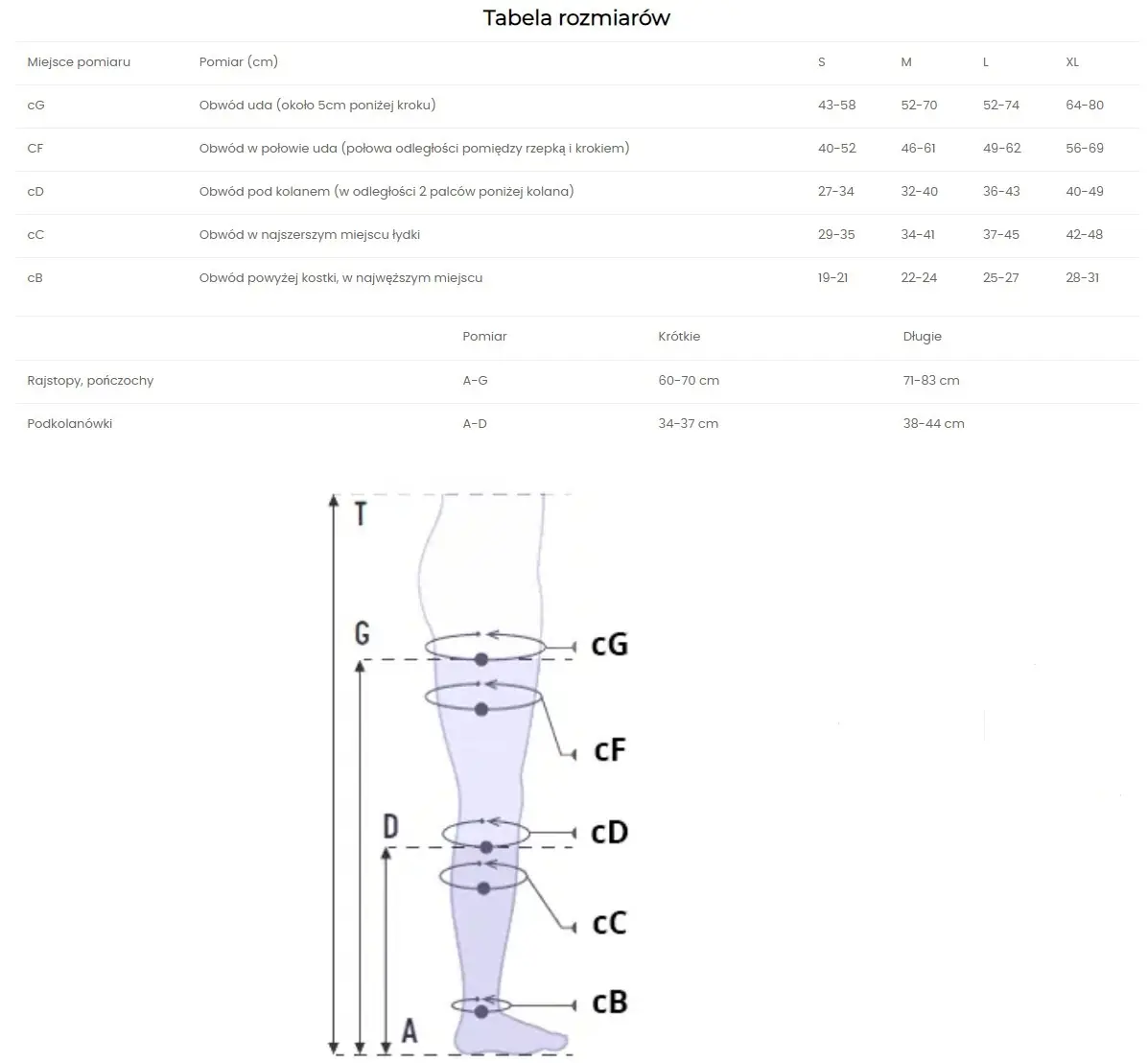 Dobór rozmiaru: W celu właściwego doboru rozmiaru, należy zmierzyć obwody nóg (lewej i prawej) w miejscach wskazanych w tabeli. Pomiaru należy dokonać rano, po nocnym odpoczynku.
