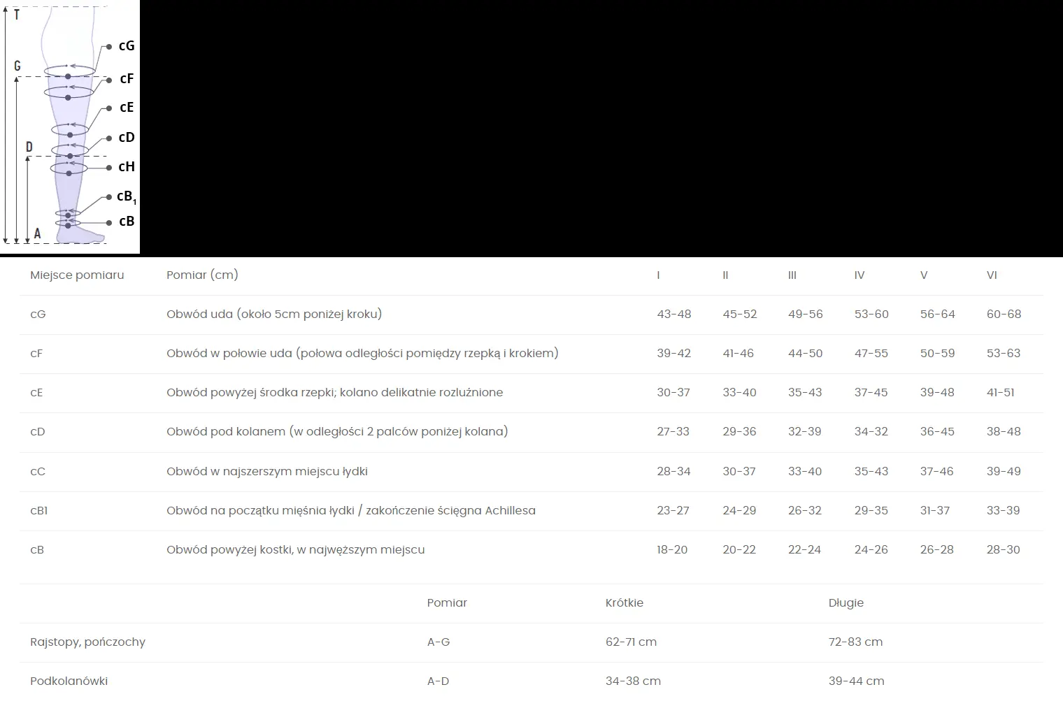 Dobór rozmiaru: W celu właściwego doboru rozmiaru, należy zmierzyć obwody nóg (lewej i prawej) w miejscach wskazanych w tabeli. Pomiaru należy dokonać rano, po nocnym odpoczynku.