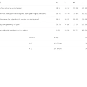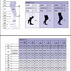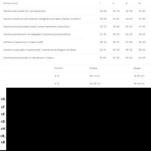 Dobór rozmiaru: W celu właściwego doboru rozmiaru, należy zmierzyć obwody nóg (lewej i prawej) w miejscach wskazanych w tabeli. Pomiaru należy dokonać rano, po nocnym odpoczynku.