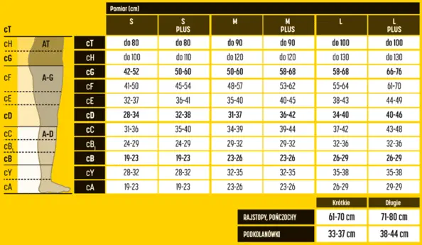 Dobór rozmiaru: W celu właściwego doboru rozmiaru, należy zmierzyć obwody nóg (lewej i prawej) w miejscach wskazanych w tabeli. Pomiaru należy dokonać rano, po nocnym odpoczynku.