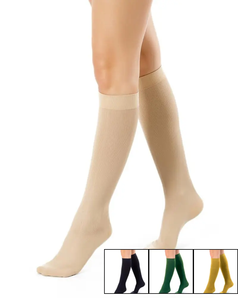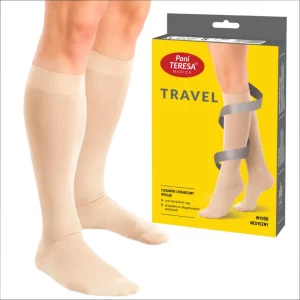 Podkolanówki PANI TERESA ® Travel, to produkt medyczny przeznaczony dla kobiet, które powinny stosować profilaktykę przeciwżylakową podczas podróży, ale również ze względu na wykonywaną pracę, spędzają większość dnia w pozycji siedzącej. Stosowanie podkolanówek PANI TERESA ® Travel zmniejsza uczucie zmęczonych i ciężkich nóg oraz działa kojąco na opuchliznę i obrzęki kończyn dolnych.