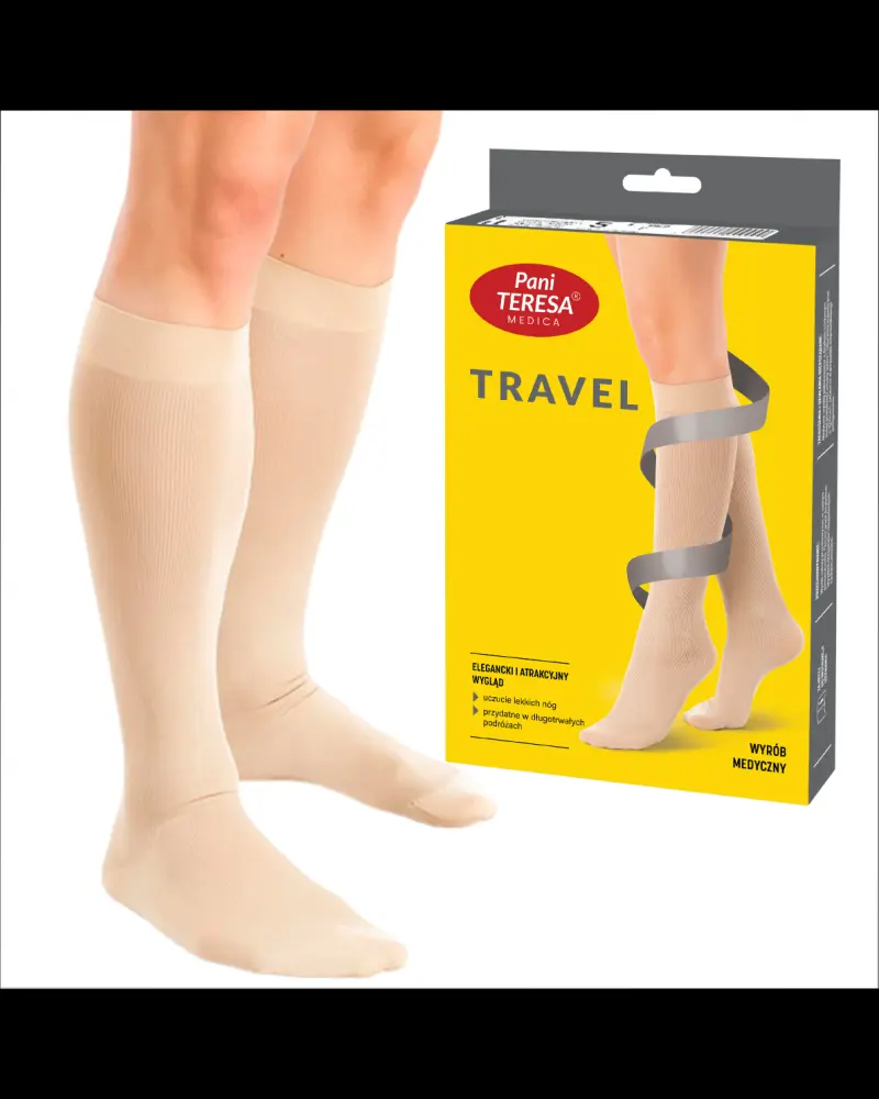 Podkolanówki uciskowe PANI TERESA ® Travel, to produkt medyczny przeznaczony dla mężczyzn, którzy powinni stosować profilaktykę przeciwżylakową podczas podróży, ale również ze względu na wykonywaną pracę, spędzają większość dnia w pozycji siedzącej.