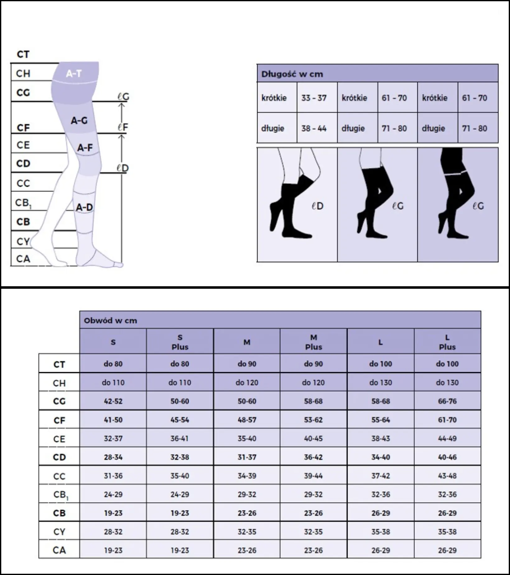 Dobór rozmiaru: W celu właściwego doboru rozmiaru, należy zmierzyć obwody nóg (lewej i prawej) w miejscach wskazanych w tabeli. Pomiaru należy dokonać rano, po nocnym odpoczynku.